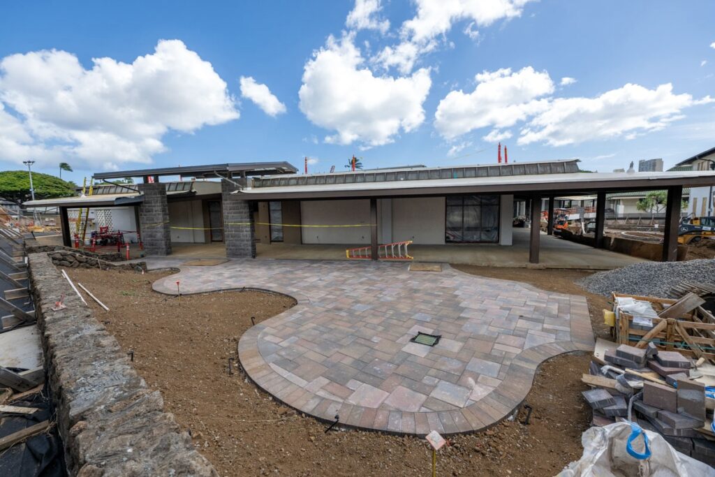Beyond the building itself, site work between Alexander Hall and the Pukui Learning Commons is progressing well. The area’s grading is taking shape, and crews have begun constructing the CRM (coral rock masonry) seat walls – an early step in defining the outdoor gathering spaces and landscaping that will connect the Commons to the heart of campus.