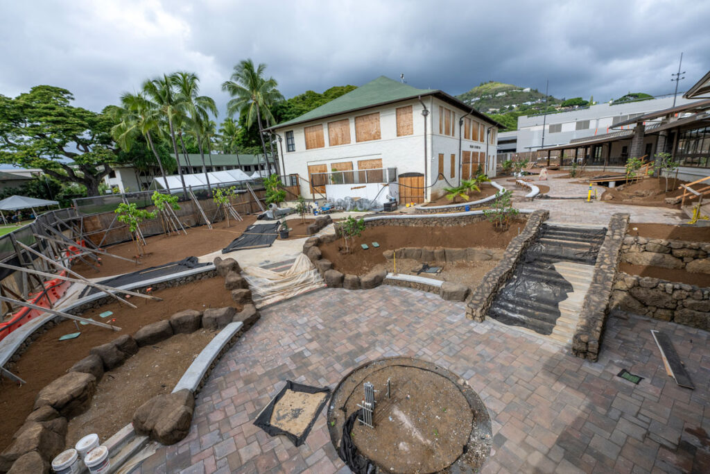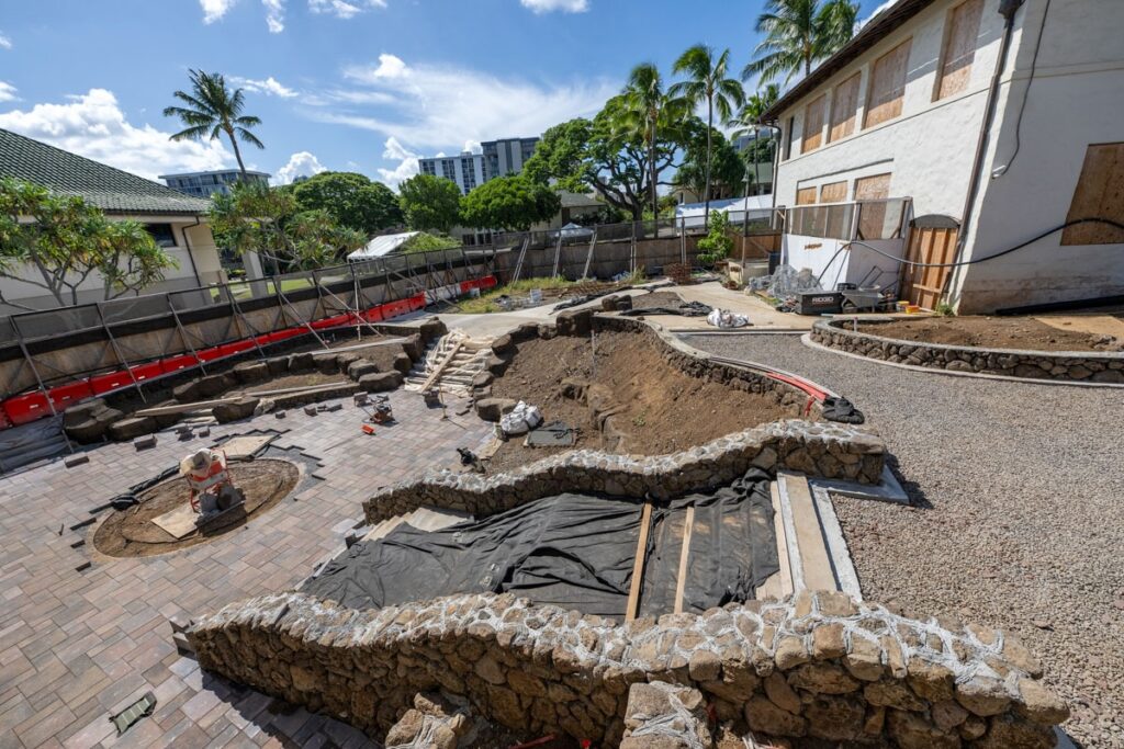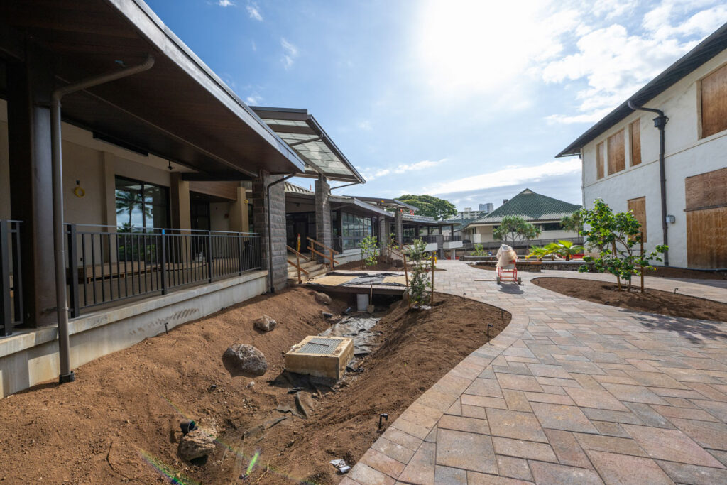 Exterior work between Alexander Hall and the Pukui Learning Commons is progressing well. Grading is nearly complete, and the coral rock masonry seat walls are finished. Landscaping has begun, incorporating native plants featured in ʻOlelo Noʻeau catalogued by Mary Kawena Pukui.