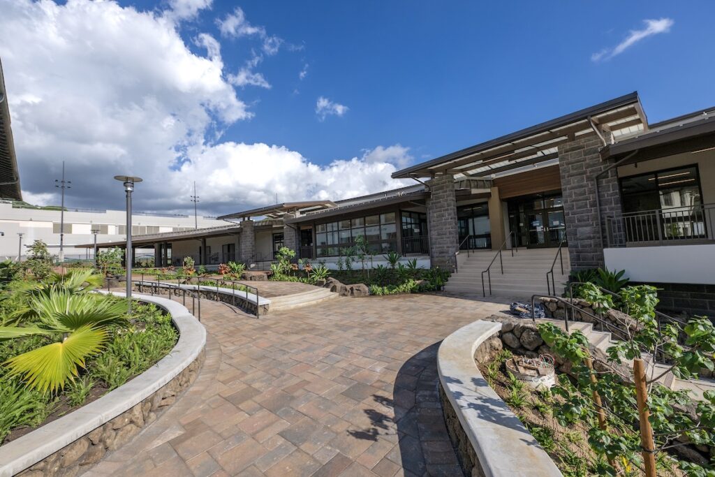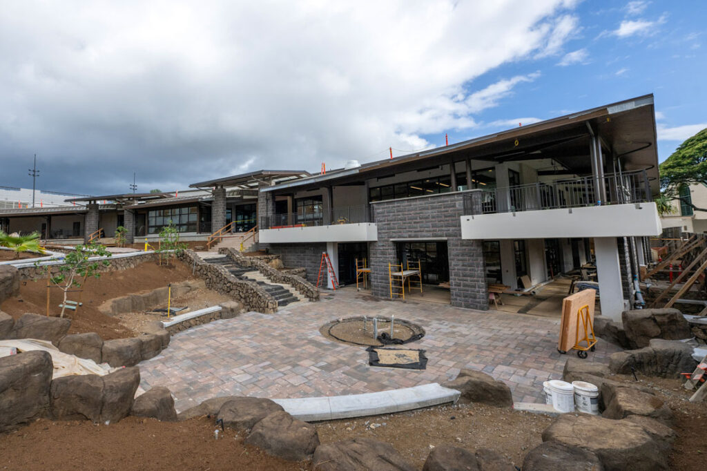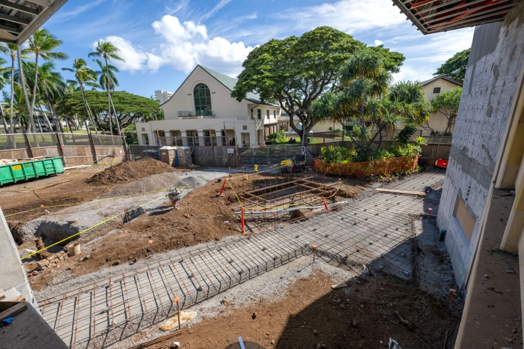 The courtyard between Alexander Hall and the Pukui Learning Commons is also taking shape, with site development now clearly revealing the structure and intent of the future student social space. This area will serve as a vital connector and gathering spot at the heart of campus.